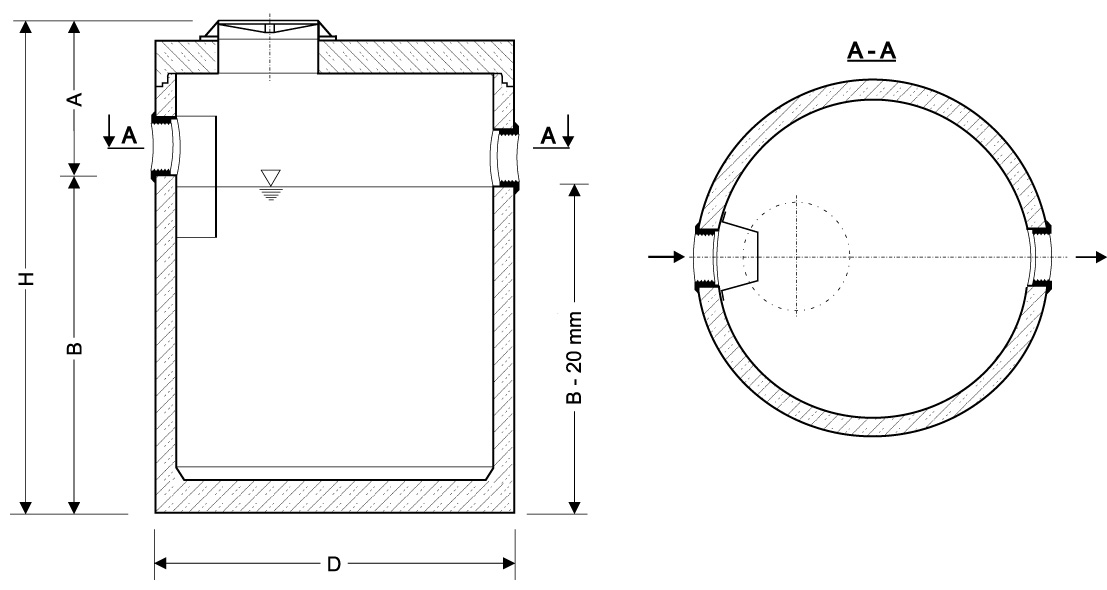 - W przypadku rzeczywistego zagłębienia kanalizacji większego od wartości “A” należy nadbudować separator nadstawkami regulacyjnymi