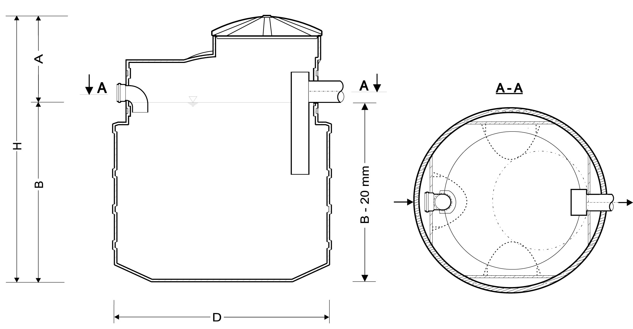- Wyposażenie standardowe separatora stanowi pływakowe odcięcie odpływu zabezpieczające przed wypłynięciem zdeponowanych substancji ropopochodnych oraz pionowy kanał do poboru prób w odpływie.
