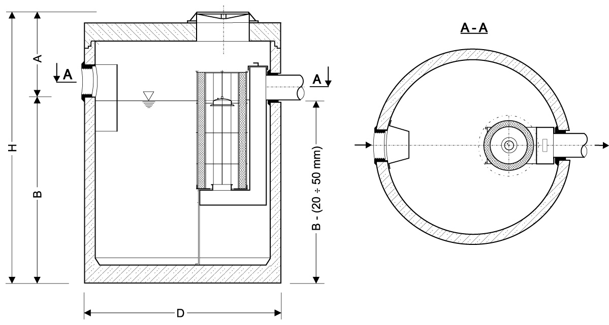 - W przypadku rzeczywistego zagłębienia kanalizacji większego od wartości “A” należy nadbudować separator nadstawkami regulacyjnymi